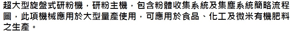 至於大型機(正式量產用)一小時的產量可達到500公斤至1公噸,且24小時不用停機,擁有良好的空氣冷卻系統之自然對流設計與完善的散熱系統,所以能夠承受長時間的研磨, 一般的研粉機只要運作八個小時,即會產生高溫,至少4小時就要停機一次,長時間連續運轉,機械就會因過熱而容易故障,且破壞研磨物之成分。 大型機之基本設計,已克服塑化劑之問題,沒有受到任何汙染,使用上絕對安全。